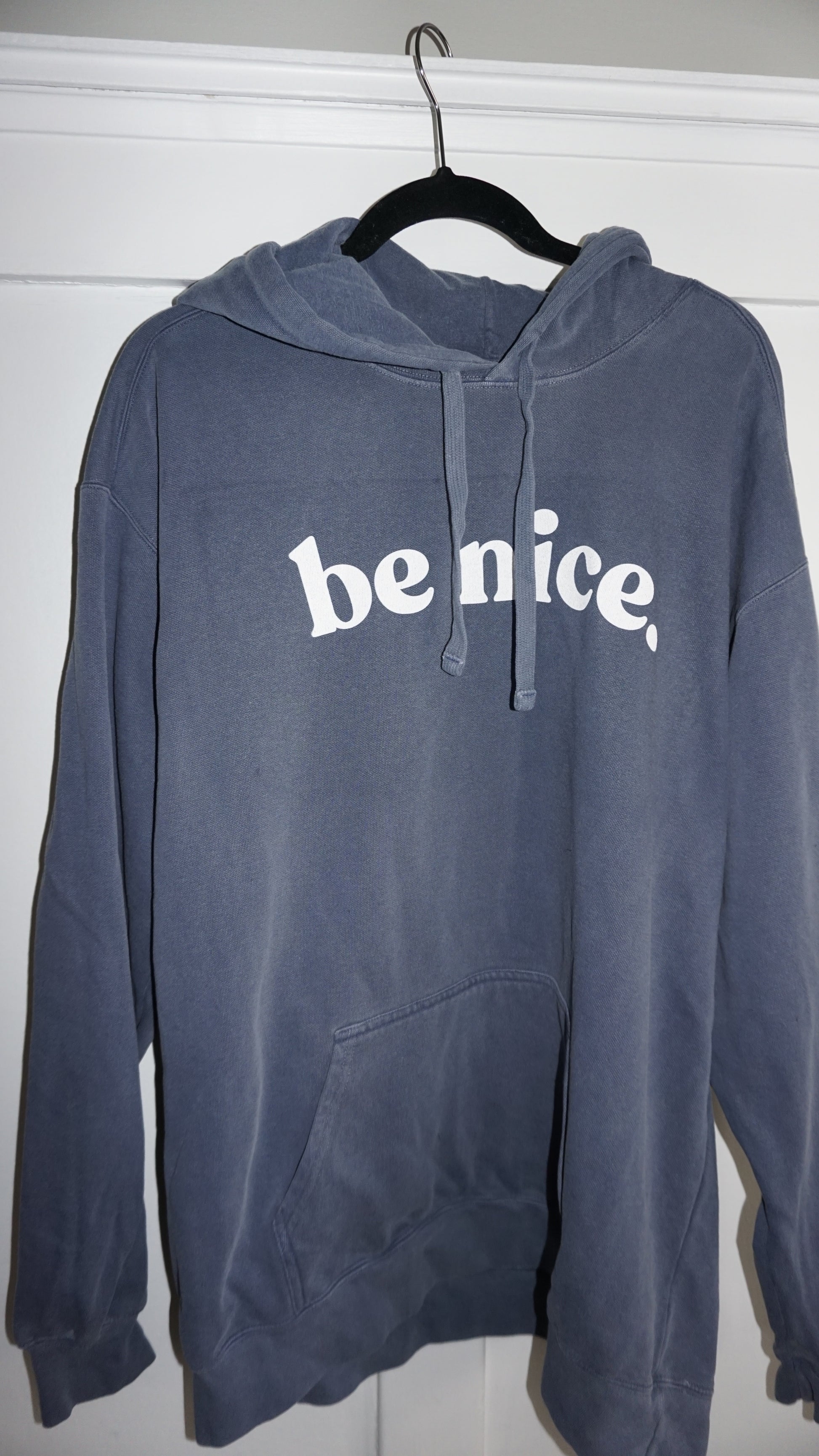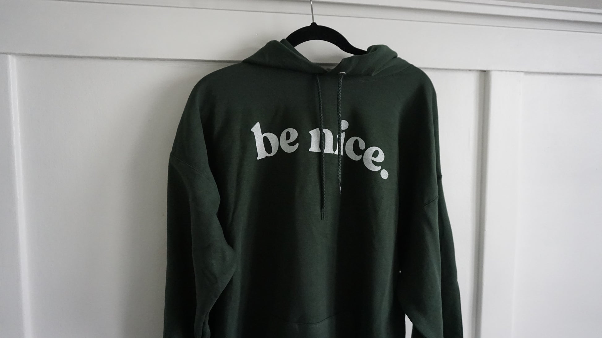 Forest green and light blue "be nice" hoodie.
